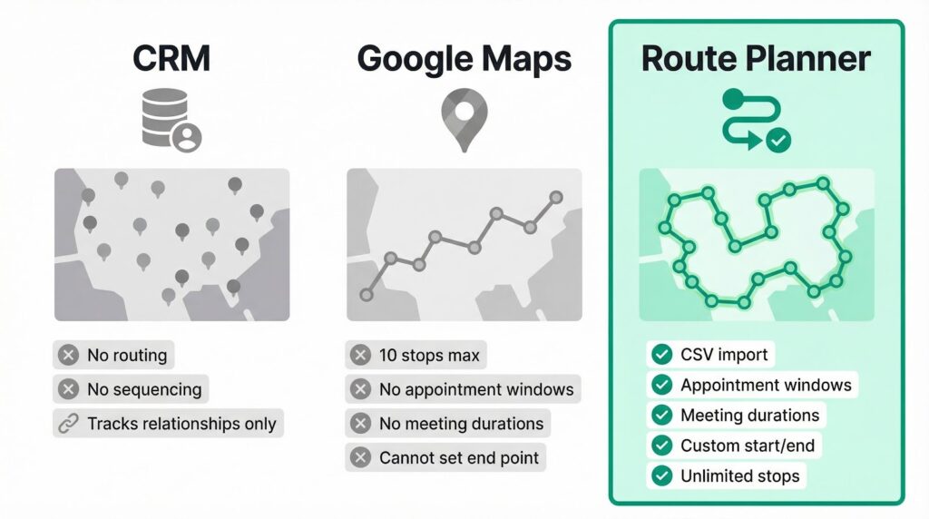 Your CRM knows where your accounts are. It cannot sequence them into an efficient driving order. It tracks relationships, not roads.