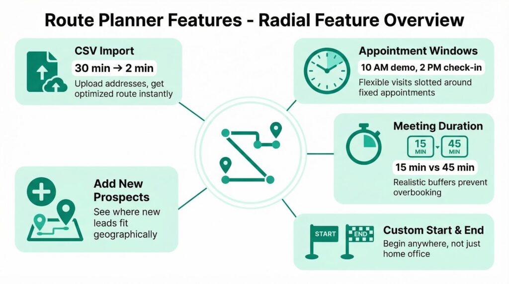 Handles appointment windows. A 10 AM demo and a 2 PM check-in need different treatment. The tool should slot flexible visits around your fixed appointments automatically.