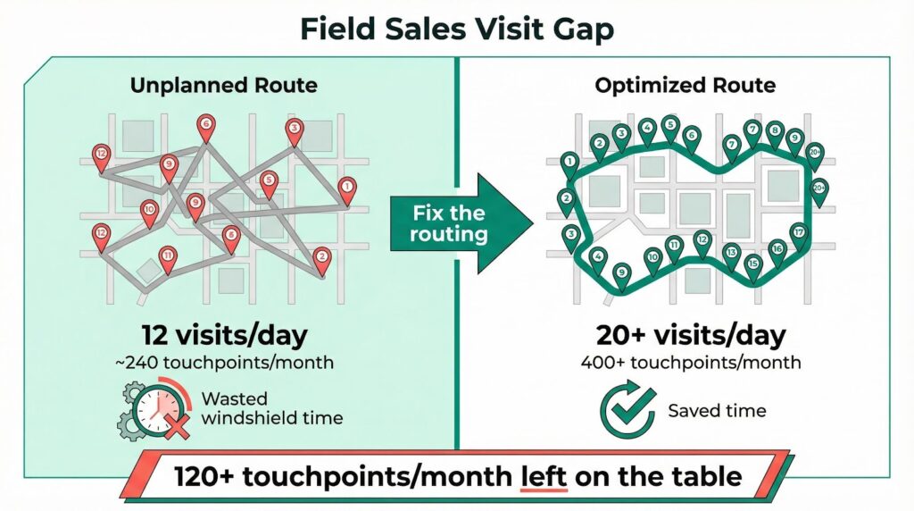 A rep averaging 12 visits per day instead of 18 leaves roughly 120 potential touchpoints per month on the table. That gap shows up directly in pipeline and closed revenue. It is not a scheduling problem. It is a routing problem.