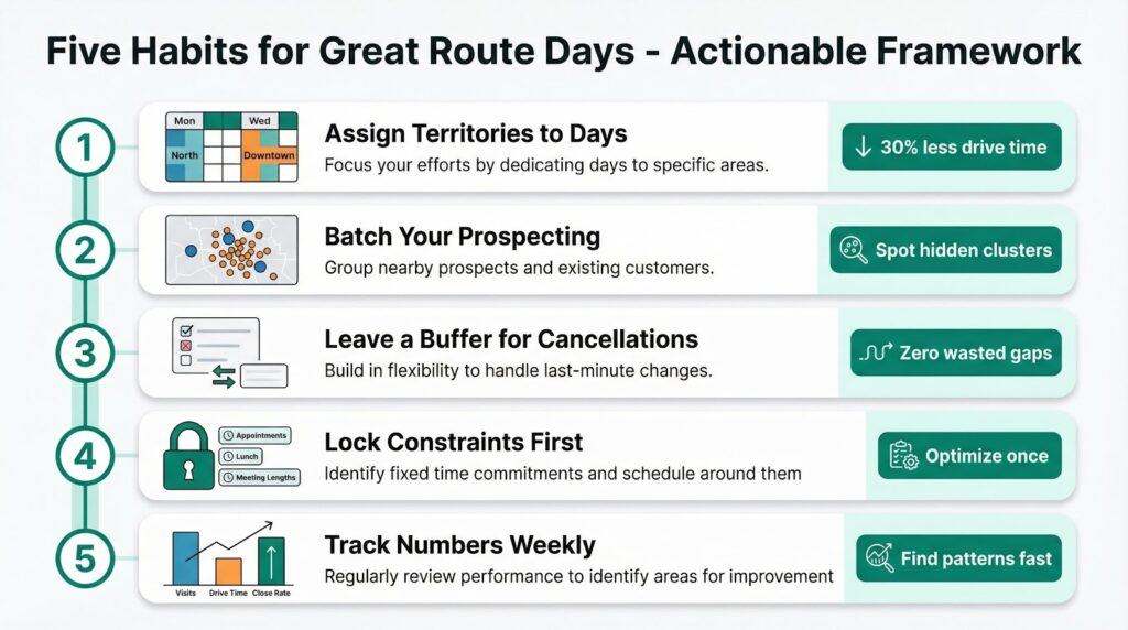 Assign territories to days. Give geographic zones specific days of the week. Monday is the north side. Wednesday is downtown. This alone can cut drive time by 30 percent because you stop crossing your entire territory daily.